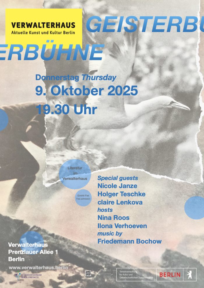 Geisterbühne ! Literature Evening at Verwalterhaus Berlin. Thursday October 9. 2025. Readings and performances by claire Lenkova, Holger Teschke, Nicole Janze. Hosts Nina Roos and Ilona Verhoeven. Music by Friedemann Bochow. Geisterbühne is de Lesebühne in het Verwalterhaus Berlin. Nieuwe sound, nieuwe teksten en nieuwe connecties op het literaire podium, met gasten, muziek en Ilona...